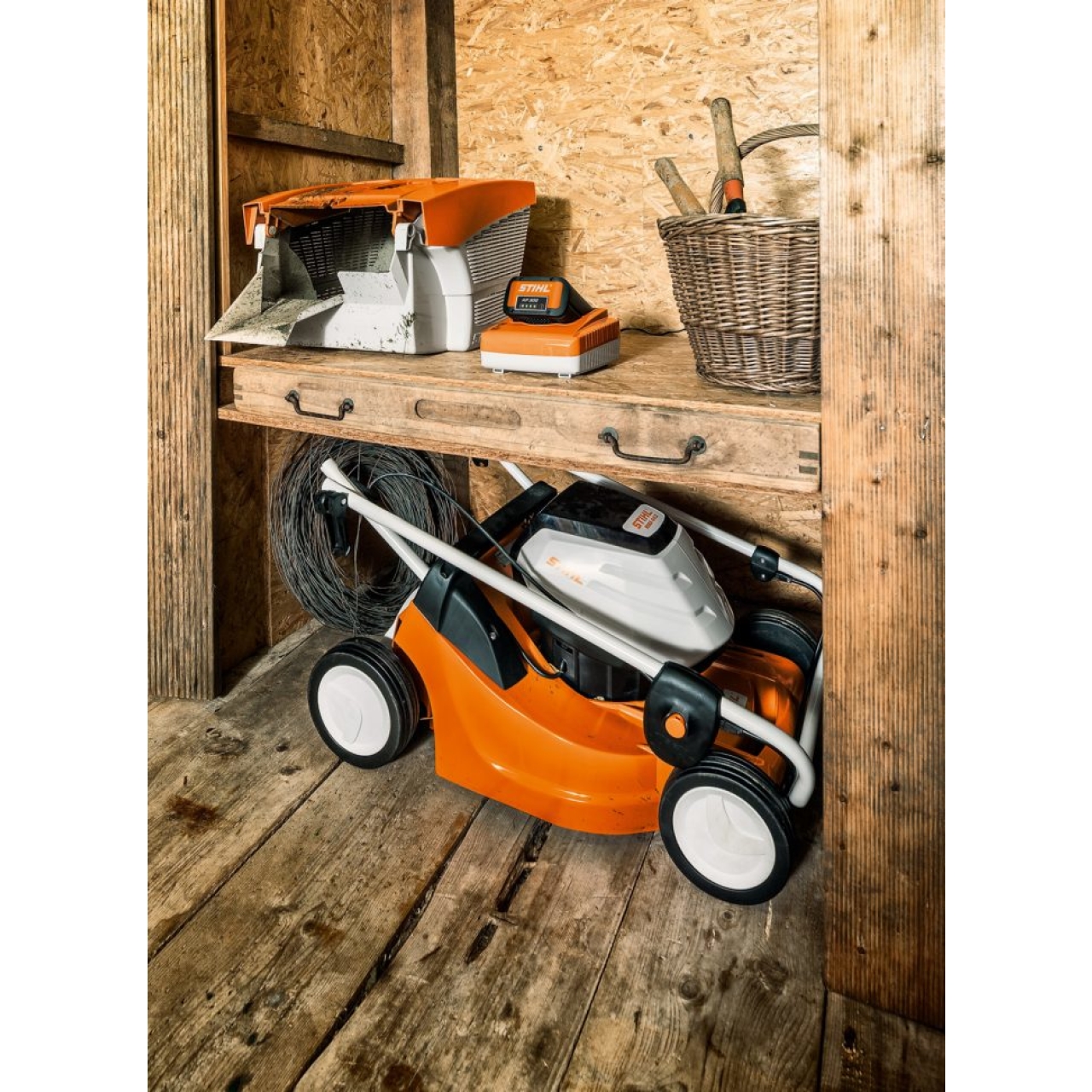 Stellen Sie hohe Ansprüche an die Mobilität Ihres Rasenmähers, ist der STIHL RMA 443 eine kluge Wahl. Ausgestattet mit den hochwertigen Lithium-Ionen-Akkus aus dem STIHL AP-System, verfügt der Rasenmäher über hohe Energiereserven. Damit diese Leistung ökonomisch eingesetzt wird, arbeitet der zuschaltbare Eco-Modus des Motors in Verbindung mit dem strömungsoptimierten Messer besonders sparsam. Der klappbare Grasfangkorb nimmt eine Menge Schnittgut auf und ist einfach zu entleeren. Damit auch Sie beim Rasenmähen keine überflüssige Energie aufwenden müssen, lässt sich der STIHL RMA 443 leicht manövrieren, ist verhältnismäßig leicht und kann dank Quick-Fix-Schnellspanner zügig und platzsparend verstaut oder transportiert werden.