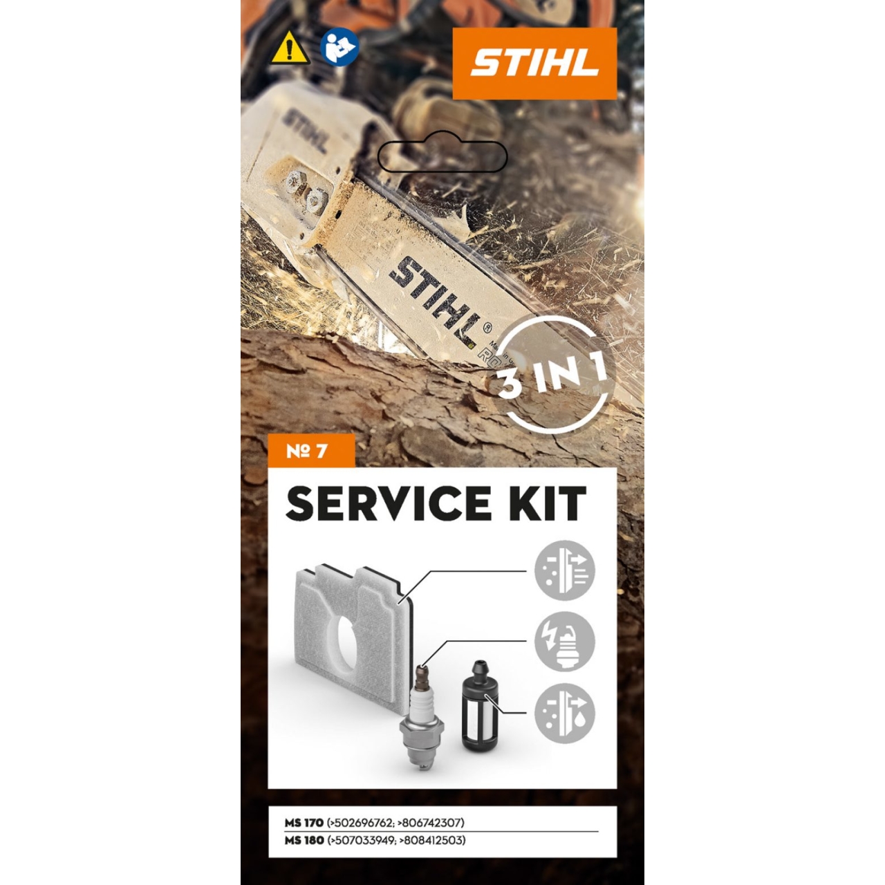 Im STIHL Service Kit 7 für MS 170 (nicht 2-Mix) (Maschinennummer > 502696762; > 806742307) und MS 180 (nicht 2-Mix) (Maschinennummer > 507033949; > 808412503) erhalten Sie folgende Komponenten für eine Standard-Wartung:
